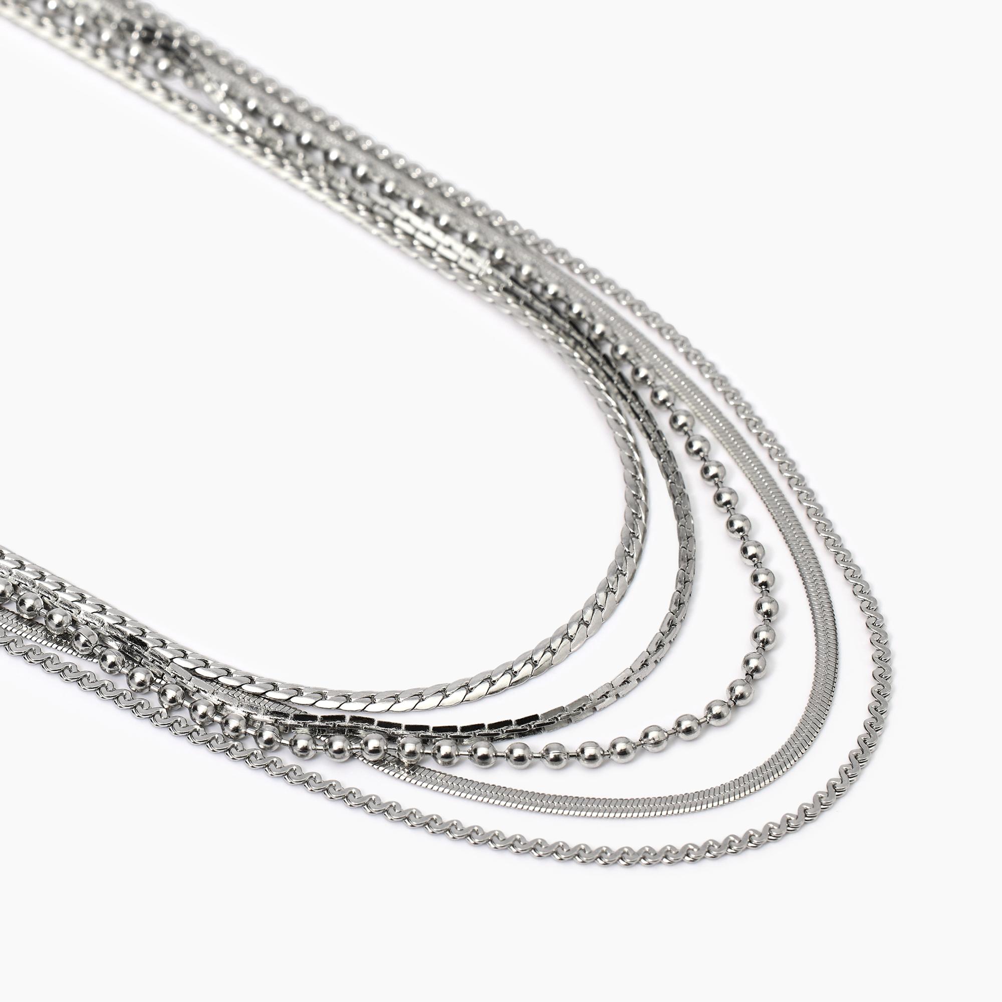 Girocollo in acciaio con catene multiple di diverse lunghezze.